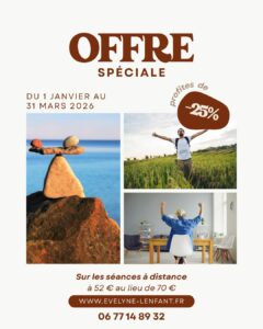 Pour bien démarrer l’année, je t’offre une réduction de – 25% sur les séances à distance à 52€ au lieu de 70€ valable du 01 janvier au 31 mars 2026.